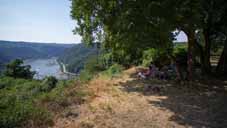 Beim ersten Hundegang am Morgen war mir schon klar, dass es ein extrem warmer Tag werden würde: Das Außenthermometer, dass unter dem WoMo-Boden angebracht ist, zeigte schlappe 34°C an. So blieb uns eigentlich nur übrig, den Großteil des Tages bei bester Sicht auf den Rhein in Hitzestarre zu verbringen. Der Campingplatz hatte sich am Vormittag geleert - die ganzen Gäste waren tatsächlich wegen des Konzerts gekommen. Der ein oder andere kurze Hundegang mit Visite auf dem Loreley-Felsen und ein Mittagessen am Bistro waren so ziemlich alles, wozu wir uns aufraffen konnten.
